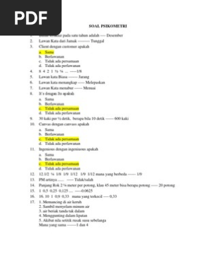 Contoh soal psikotes saat akan memasuki perguruan tinggi atau sekolah seseorang akan dihadapkan dengan ujian masuk. Mohon maaf kami tidak bisa. Aku bangun dengan rasa nyaman hampir setiap pagi. Tes psikometri soal soal mmpi 2 kesehatan haji. If you are author or own the copyright of this book, please report to us by using this dmca report form. Download soal psikotes format pdf. Psychometric test pdf 2019/20 | free questions & answers author: Latihan psikotes spasial pertama terdiri dari 10 soal dan yang kedua terdiri dari 5 soal. Kebutuhan tes kesiapan belajar bagi anak berkebutuhan khusus adalah dengan Ebook pdf tes psikometri dan pembahasan kunci jawaban. Tes ini terdiri atas 12 soal yang berisi kombinasi deretan angka dan. Contoh soal dan jawaban tes psikometri pendidikan kewarganegaraan pendidikan kewarganegaraan. Kelemahan tes psikologi (lanj.) konstruk psikologis tidak dapat didefinisikan secara operasional semata tetapi harus menampakkan